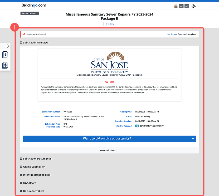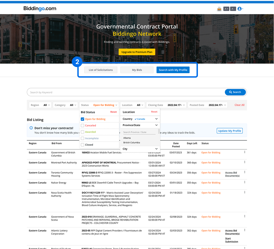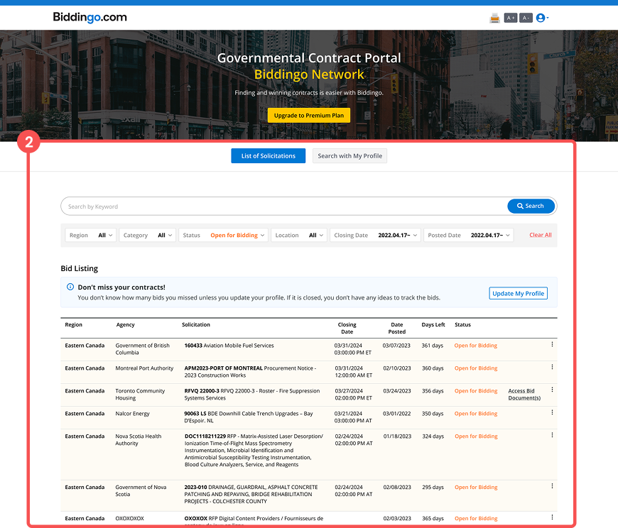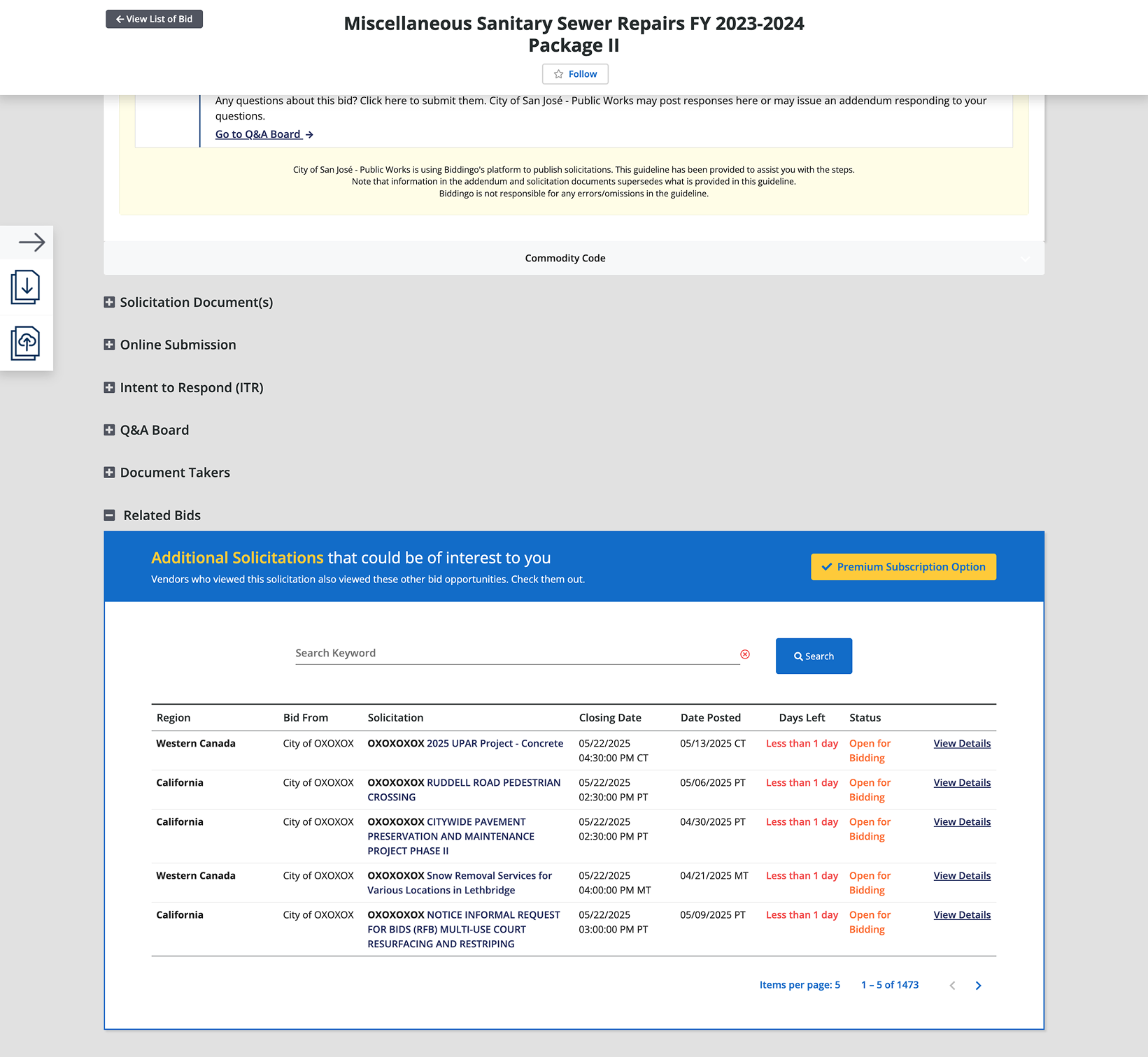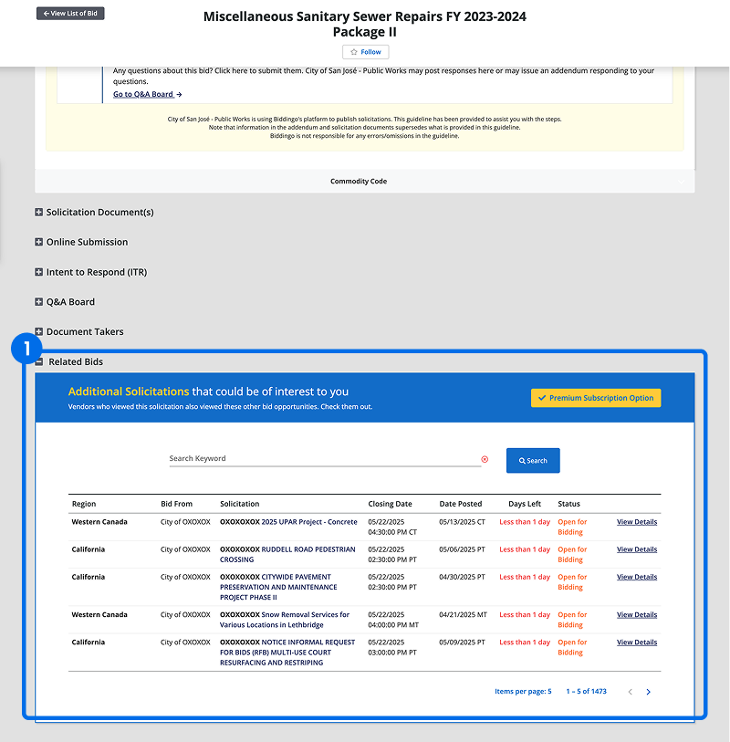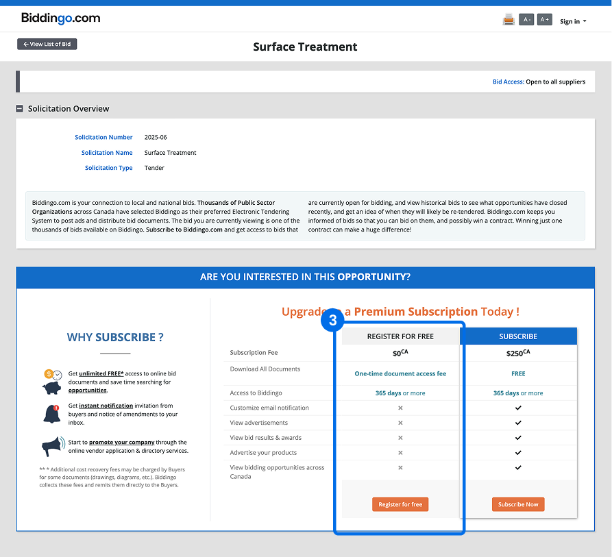Access to the most critical information such as the bid documents is gated behind a payment, creating a natural user flow from curiosity to conversion.
